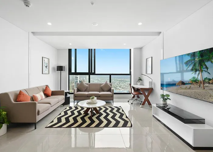 Enjoy the convenience of an equipped kitchenette in Level 72 Massive 4Bdr Penthouse Apt With Stunning Ocean Views - Pet Friendly, allowing guests to prepare their own homemade meals. The accommodation is also nearly a 50-minute ride from Coomera train station.